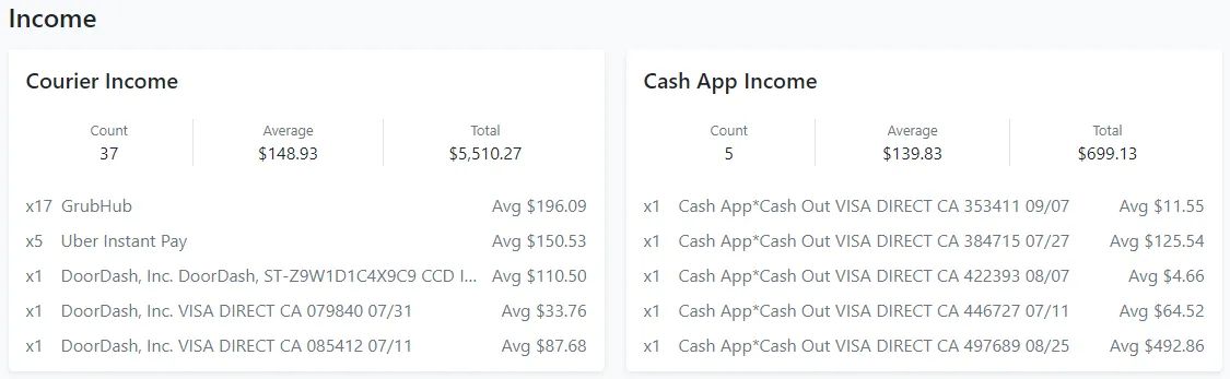 Section titled “4. Income section:”The Income section is an overview of standout trends in the applicant’s income. Primary items called out are the frequency of courier income (uber, door dash, etc.) and cash app income.