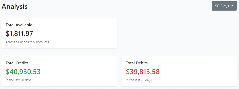 Section titled “3. Analysis section:”Provides a high-level view of the total available funds across all linked back accounts, as well as the total credits and total debits.