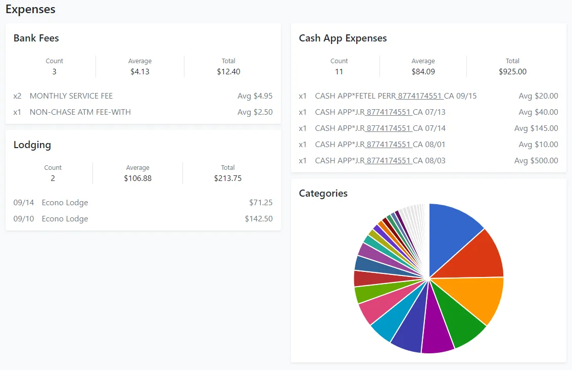 Section titled “5. Expenses section:”Calls out any stand out expenses present in the applicant’s finances. Key items highlighted are the frequency of bank fees, cash app expenses, and lodging (hotels/motels).