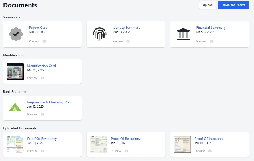 The last tab in the applicant’s profile shows all supporting documents uploaded by the applicant to their Approve Owl profile, such as proof of income, identification, or proof of residence. There is also a listing of each individual profile summary view for individual download, if desired.