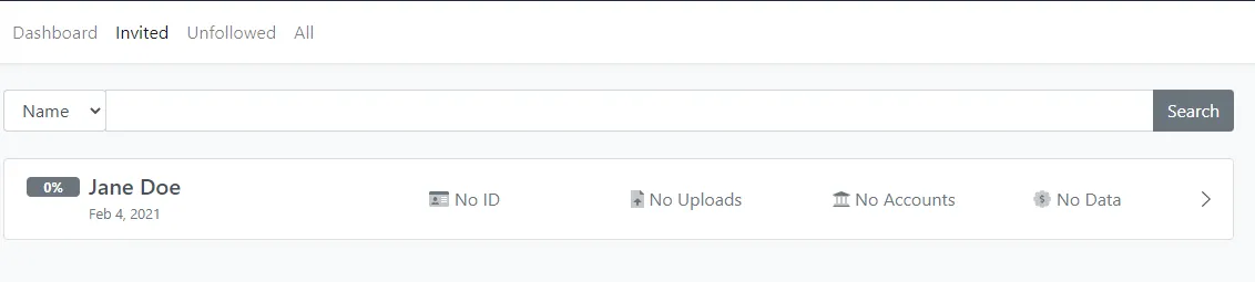 The Invites tab view of the Dashboard shows a listing of all applicants in Approve Owl that have current invites outstanding. You can choose to click on an applicant in the listing or search using the search bar at the top of the page.