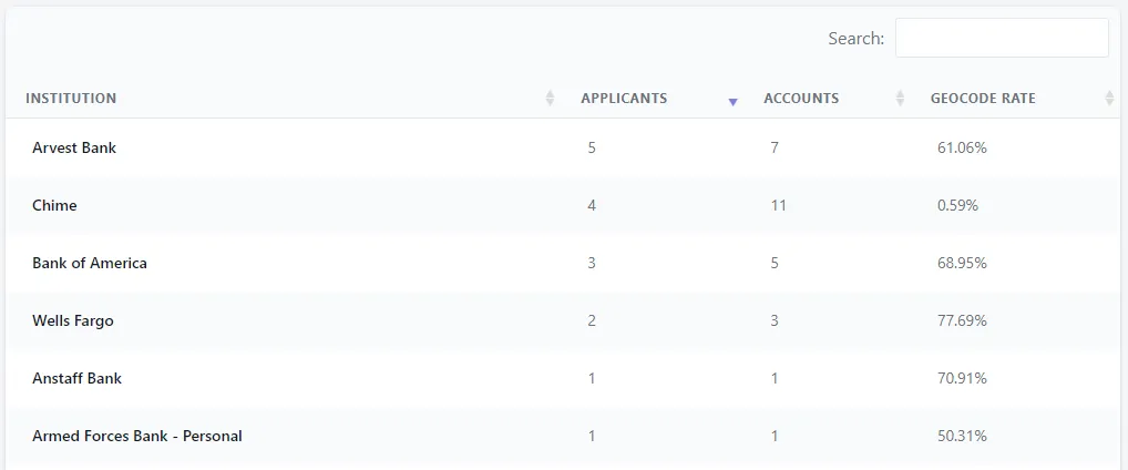 The Institutions report provides a report of banking institutions linked by applicants in your Approve Owl. If you are looking for a particular banking institution, you can utilize the Search box to the top right of the table.