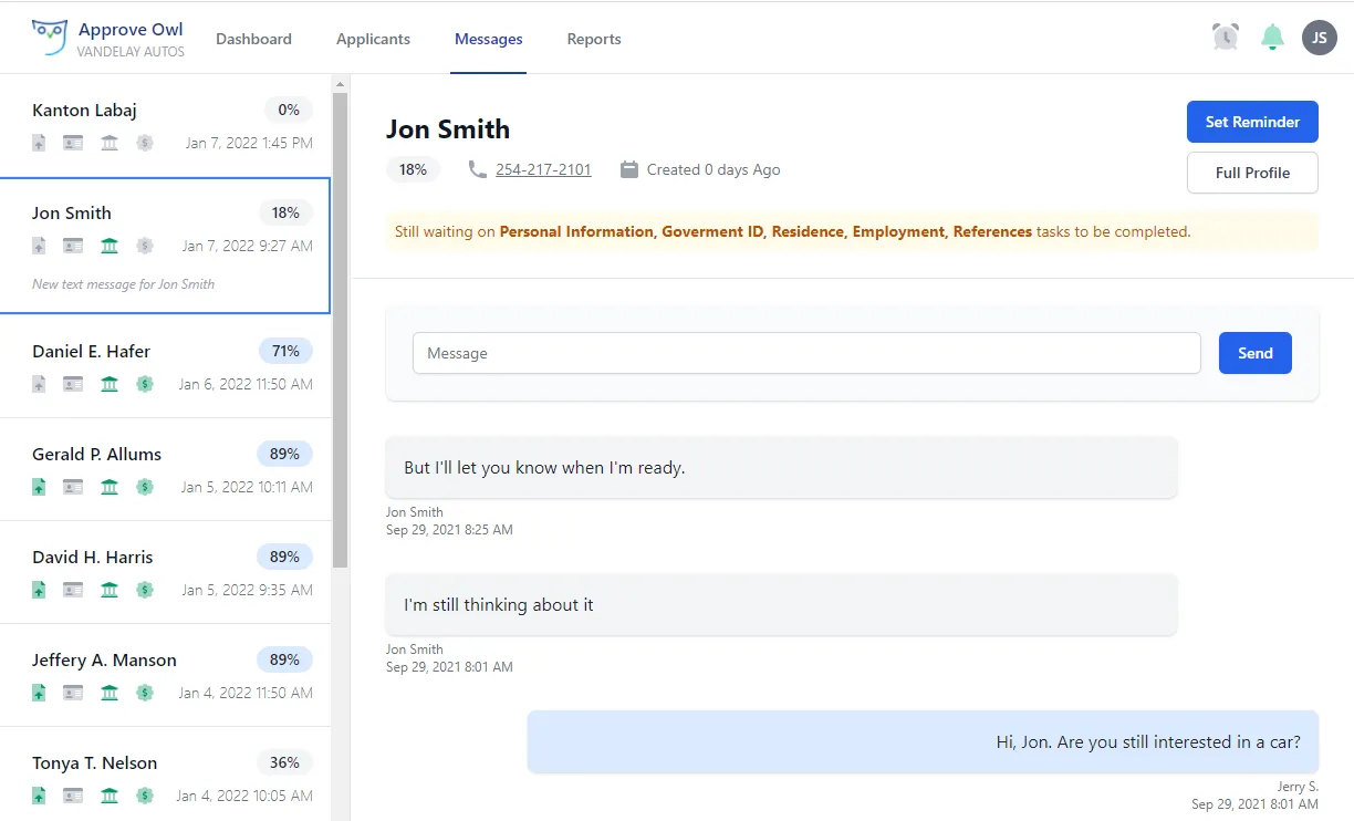 The Approve Owl Messages is a live messaging system that opens in a new browser tab for your followed applicants. To open Messages, click on “Messages” button in the top navigation, 3rd menu item to the right.