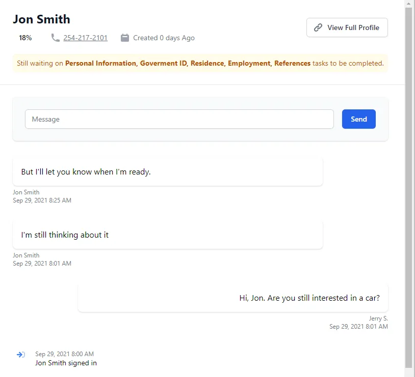 To send a new text message to the applicant, simply type your message in the “Message” input box and click the “Send” button. The communication thread is updated real time. The applicant’s Messages thread will also note any actions/updates for the applicant, such as if they complete a task.