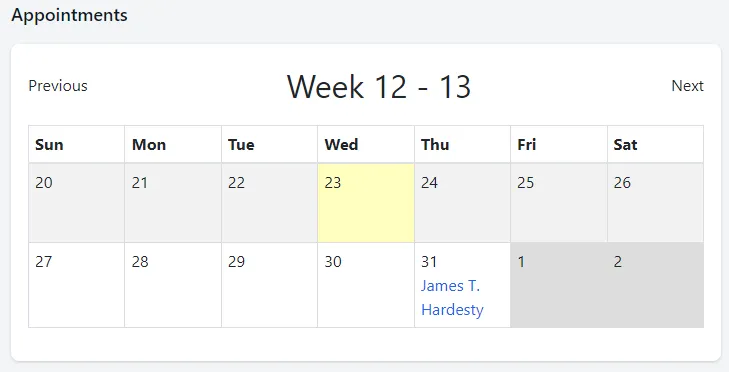 - Appointments: A 2-week view of any appointments for applicants that you follow. If an appointment is listed, it will be shown by listing the applicant’s name. You can click on the applicant’s name to go to their Approve Owl profile.