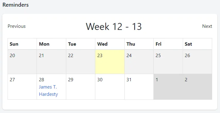 - Reminders: A 2-week view of any reminders for applicants that you follow. If a reminder is listed, it will be shown by listing the applicant’s name. You can click on the applicant’s name to go to their Approve Owl profile.