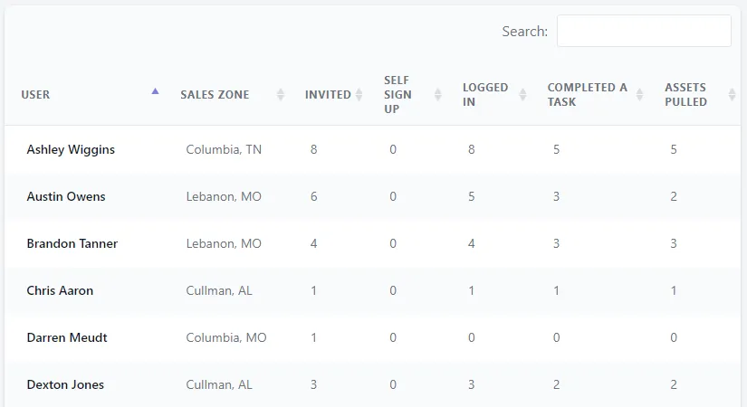 Section titled “1. Markets filter”Click in the drop down list showing “All Markets” to view a complete list of your Sales Zones. Choose the Sales Zone that you’d like to view a user metrics table specific to and click the Filter button.